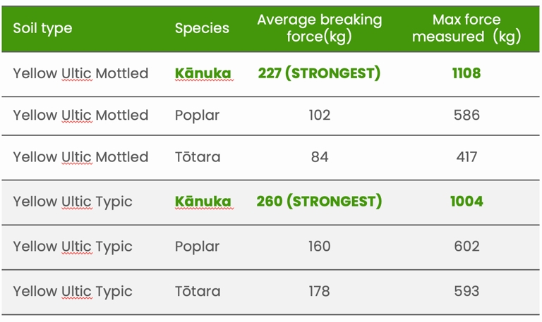 Across both the Yellow Ultic soils, kānuka roots were between 45% and 170% stronger than those of poplar or tōtara.